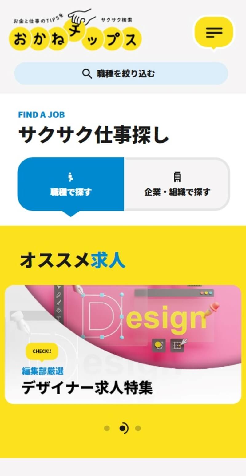 求人の詳細ページに行かずとも、「職種」「雇用形態」「給与」「勤務地」「概要」をひと目でパッと見ることができ、限られた時間で情報を探すのにとっても便利!文字の背景色や太さの変化でコンテンツを区分けしたり、それぞれの求人ブロックの大きさを均一にして整頓させたりすることで、たっぷりの情報量をストレスなく閲覧することができます。採用担当者の本音を黄色い吹き出しで知ることができるのも、明るいイメージが伝わる良いポイントだと感じました。
