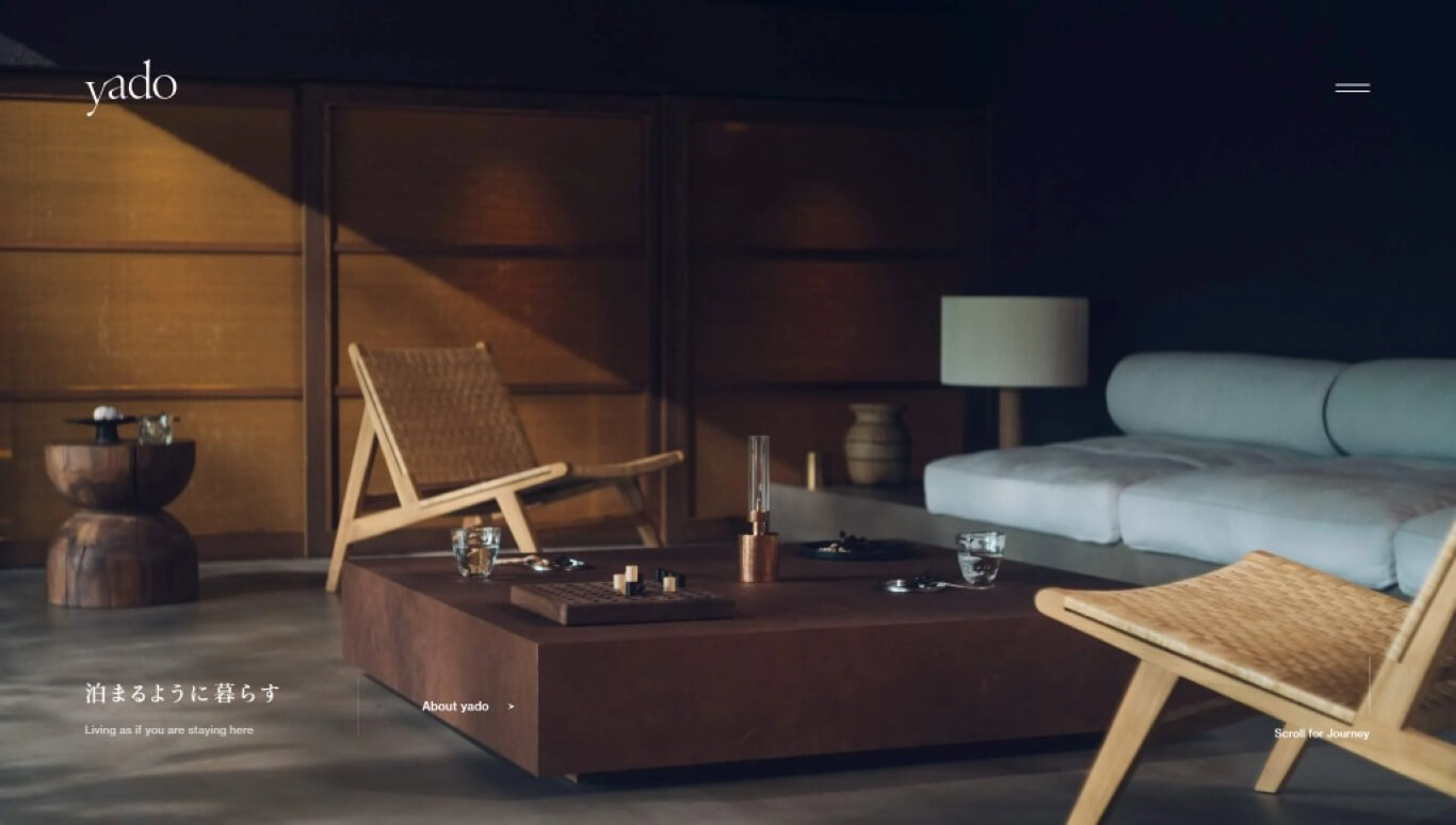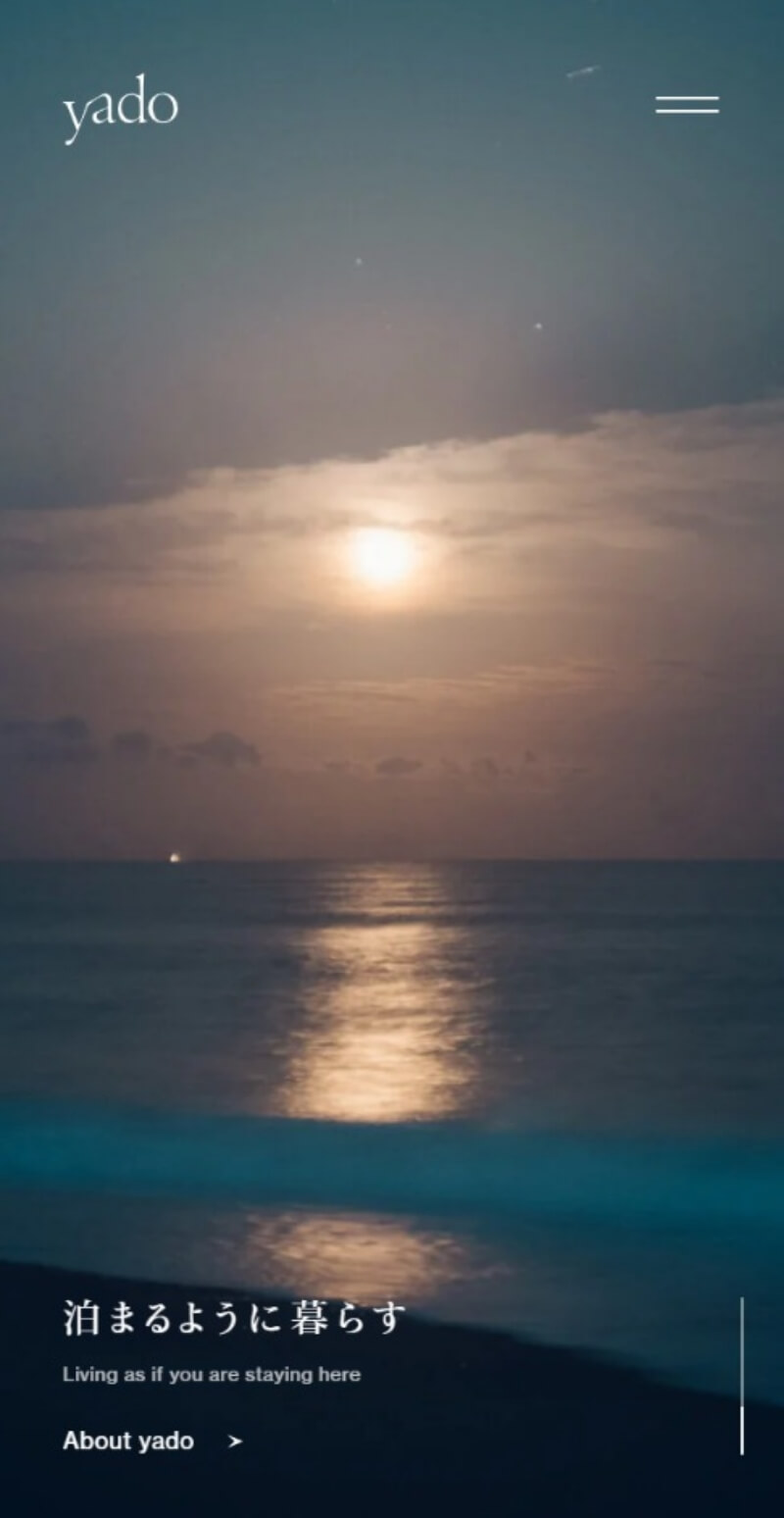 ファーストビューの動画を邪魔しないよう、ごく小さいフォントと細い線で表現されたデザインは、静かな空気感や、丁寧で上質な空間を際立たせています。