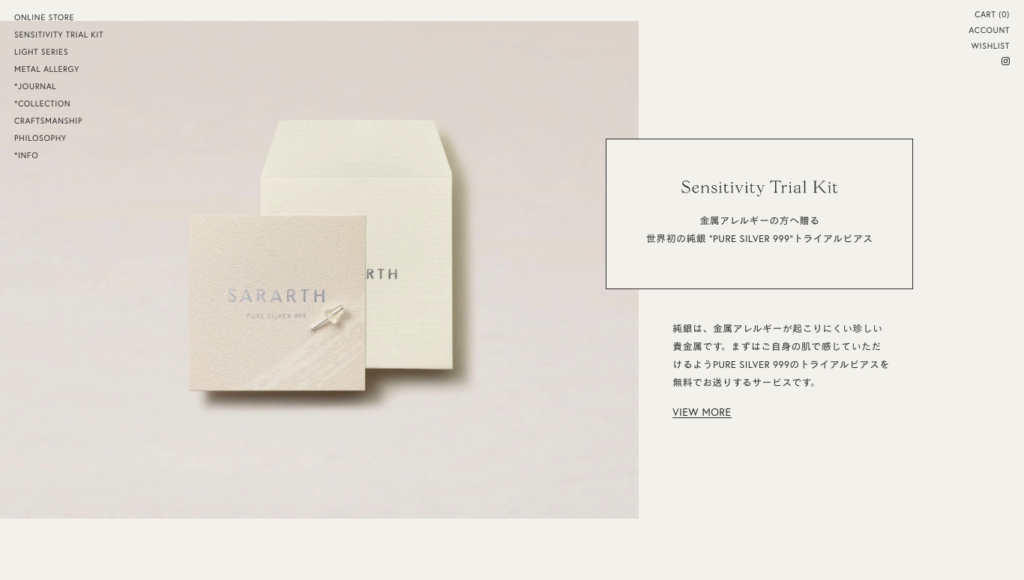 薄いベージュの背景に、ゴールドやシルバーのアクセサリーが美しく映え、全体として上品で高級感のあるサイトに仕上がっています。テキストには、洗練された印象を持つフォント「Europa」が使用されており、小さな文字でも可読性を保っています。文字サイズが小さく、繊細で落ち着いた印象が演出されているのも特徴です。