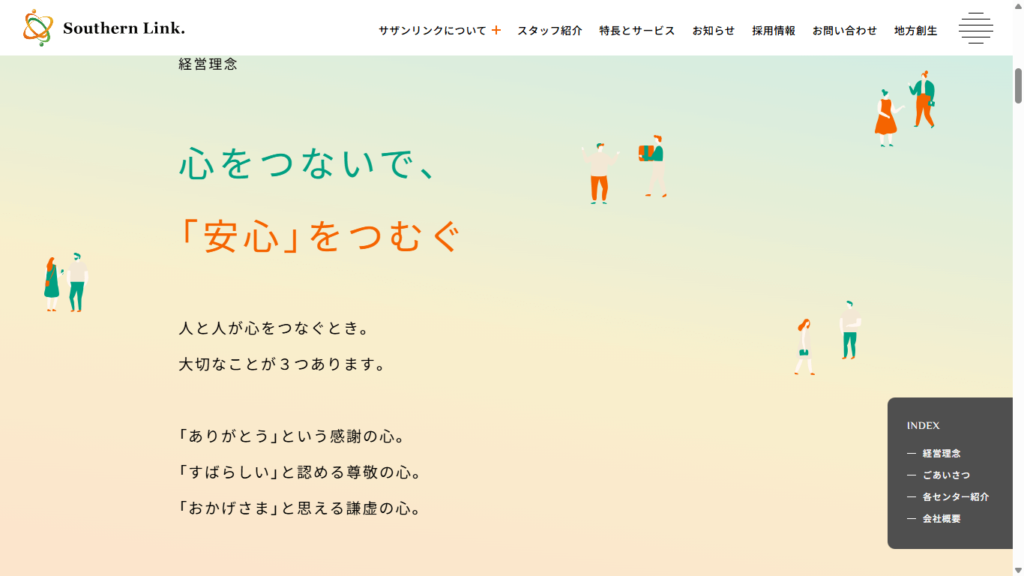 サイトのイメージカラーであるオレンジは情熱と温かみを、ライトグリーンは誠実さと安心感を感じられます。