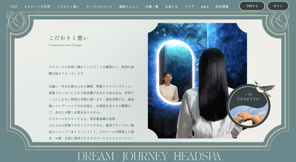 サイト全体に使用されている装飾的な要素が、まるで絵本や童話の世界のような幻想的で優雅な雰囲気を作り出しています。色調も上品で落ち着いたトーンが選ばれており、世界観を大切にしたクラシカルな空気感が感じられます。