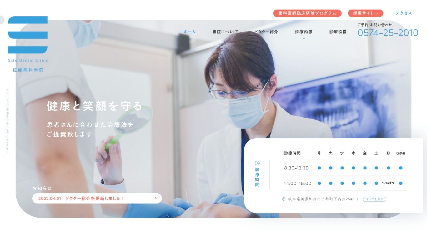 余白をゆったり取ることでスッキリとした印象になり、色数を絞ってブルーで統一感を出し爽やかさを強調しているので歯科医院の「怖い」というイメージを全く感じないクリーンなサイトだと思いました。フォント色も黒を使用していないのがいいですね。