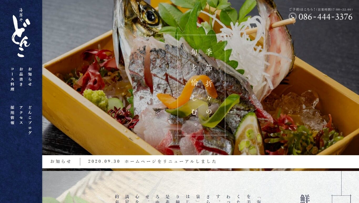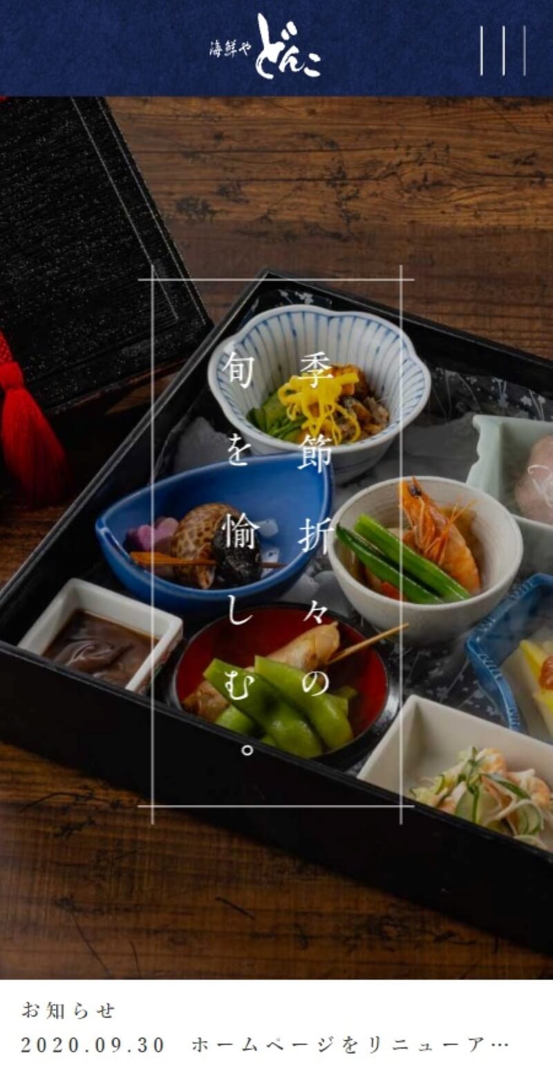 グッと目を引く濃紺の背景に、海の力強さと伝統を感じます。和紙のようなテクスチャや浮世絵を思わせる波のイラストなど細かい演出がリッチ。日常を彩るようなカラフルな見出しや金の屏風のような予約ボタンも相まって気分が高揚し、奮発して海鮮を楽しむぞ!という気持ちになります。サイズと色で表情をつけた明朝体が印象的で「読ませる縦書き」の参考にも💮