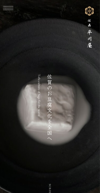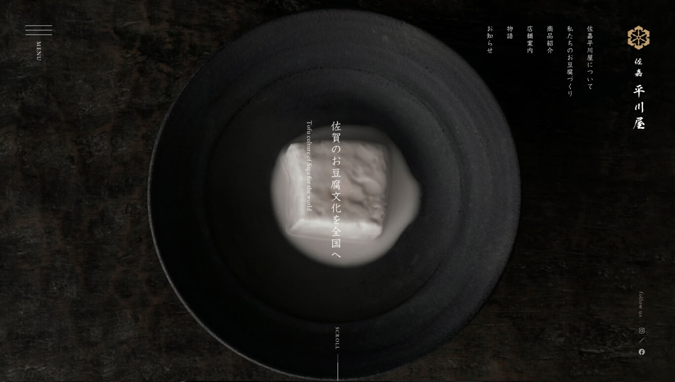 キャッチコピーが先に出てから豆腐が強調された黒背景の写真が表れるファーストビュー。表示時間をずらすことでどちらも強調される表示方法だと感じました。両サイドに均等に要素が配置されていてバランスを考えられているのも参考になります。